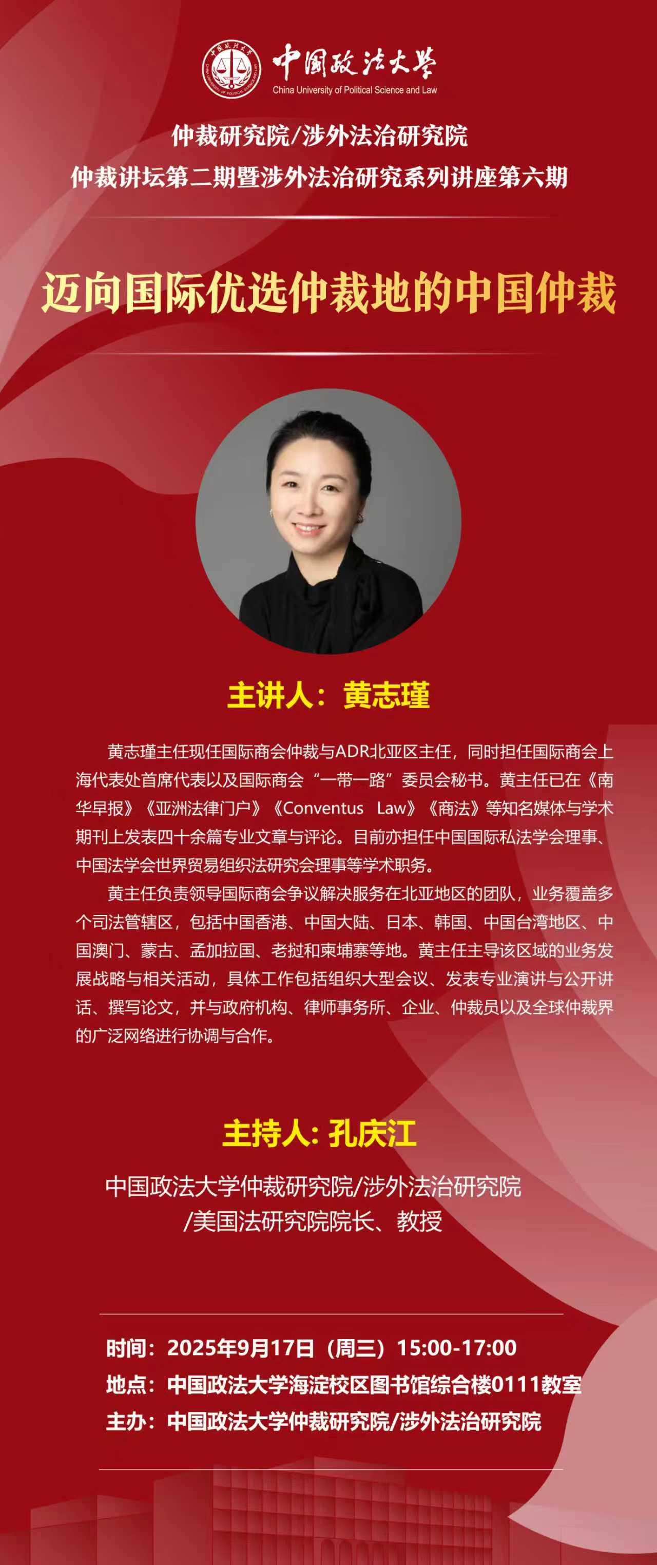 現將《邁向國際優選仲裁地的中國仲裁》講座信息通知如下,歡迎感興趣的師生積極參加: