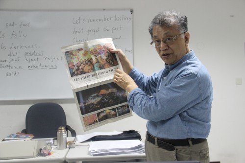 退休后的陳向榮被學校返聘,再次回到講臺,現在已經71歲的他依舊愿意和年輕的學生們在一起,因為“我也能再年輕些”。2015-2016年春季學期,每周五從中午12點到晚上9點半,他始終在厚德樓語音教室,雖然年過七旬,但依舊精神矍鑠。他幽默地解釋,“我的身體跟別人不一樣,年輕時經常在河水中游泳,堅持鍛煉。”陳向榮回憶起那時的經歷,仿佛又年輕了許多。